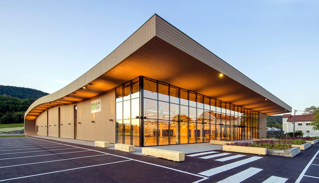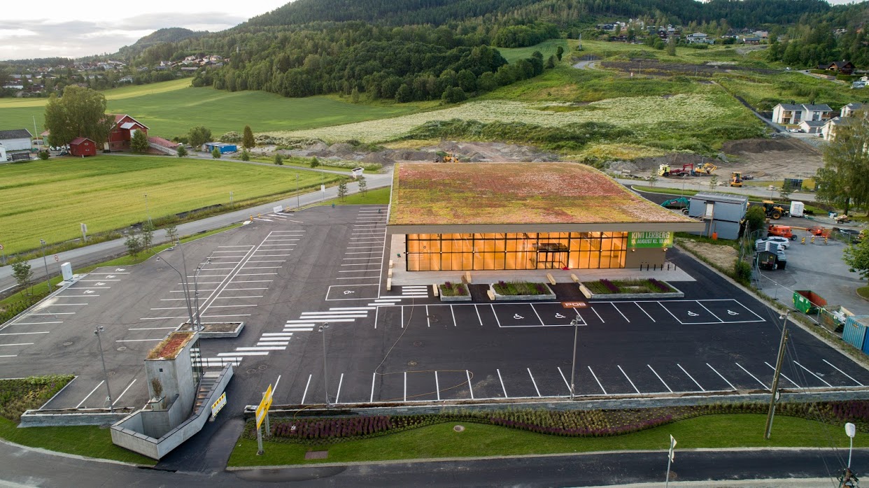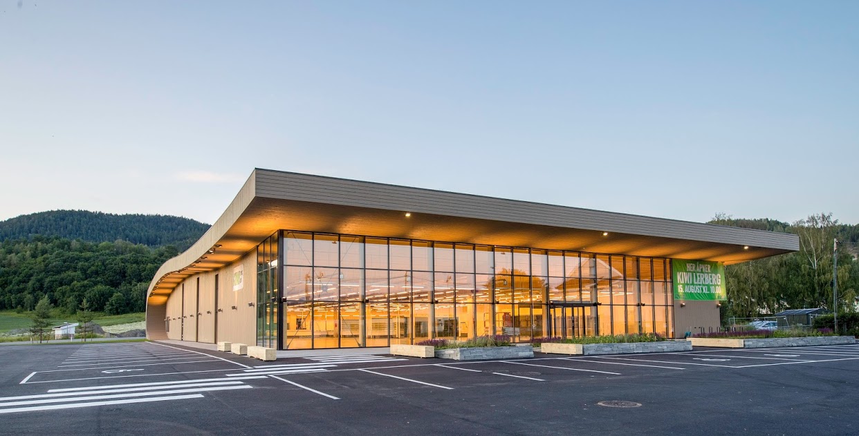 Der KIWI in Lerberg westlich von Oslo darf aktuell wohl mit Recht als Norwegens grünstes Lebensmittelgeschäft bezeichnet werden. Das markante Gebäude mit der auffälligen Dachform ist das Ergebnis eines Architekturwettbewerbs, den das renommierte Architekturbüro A-Lab mit seinem Entwurf für sich entscheiden konnte.