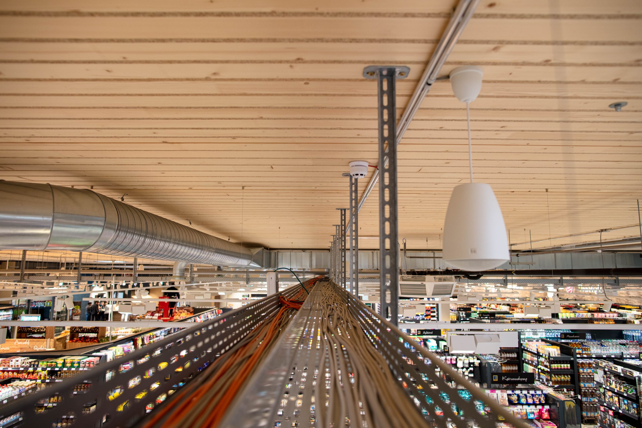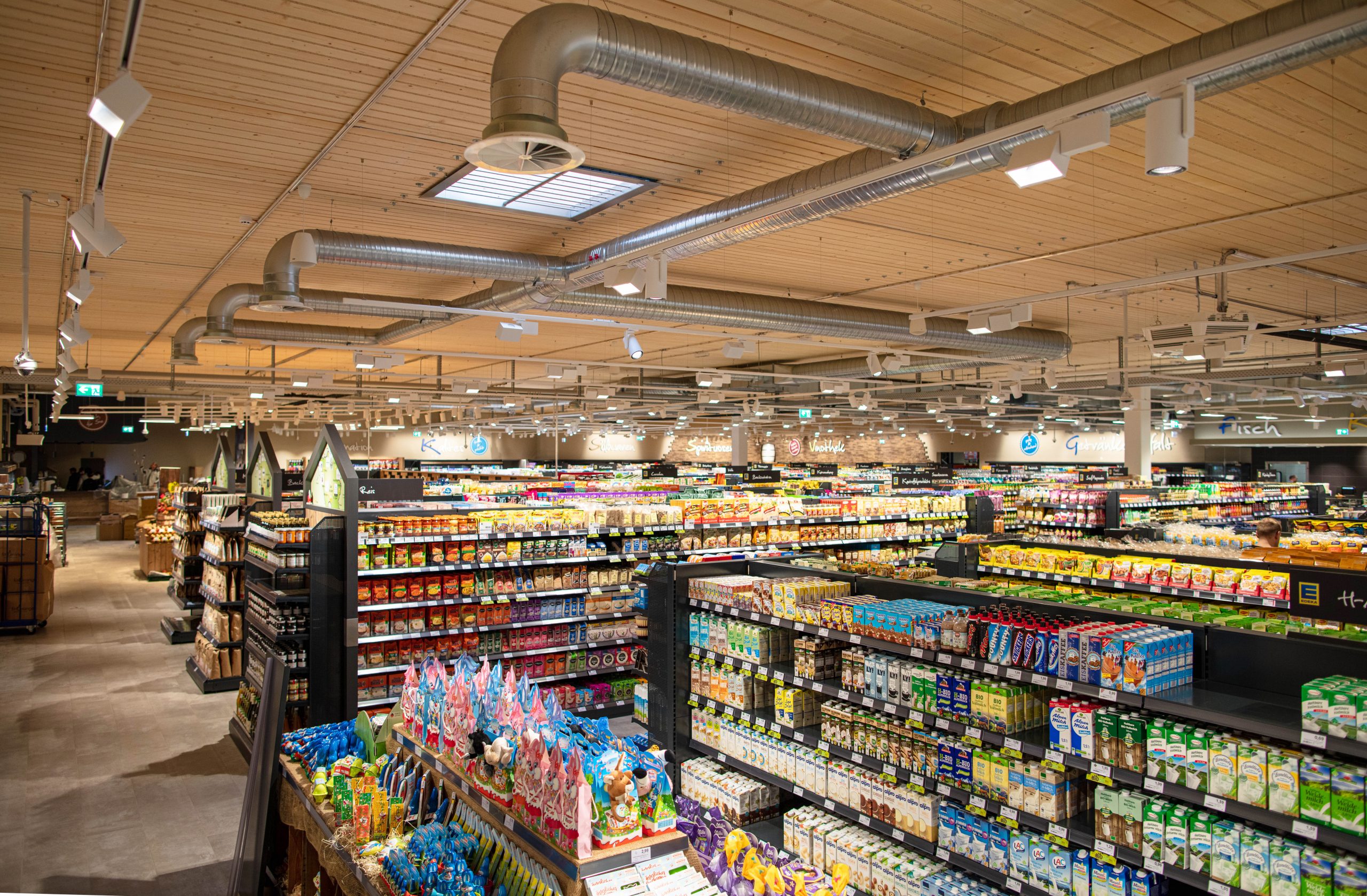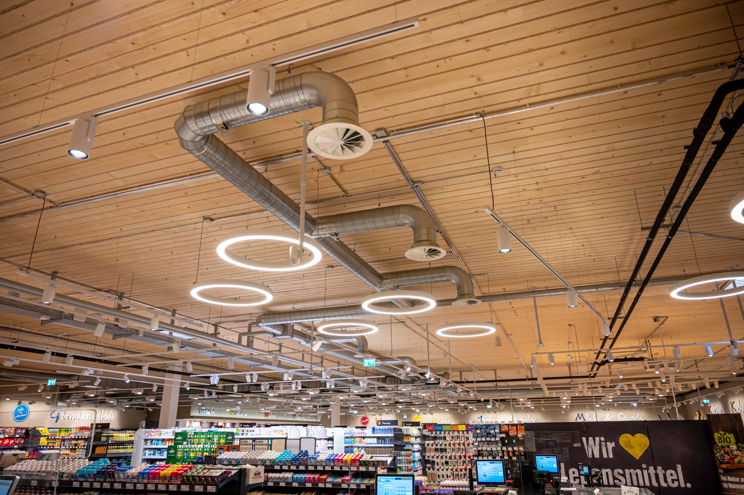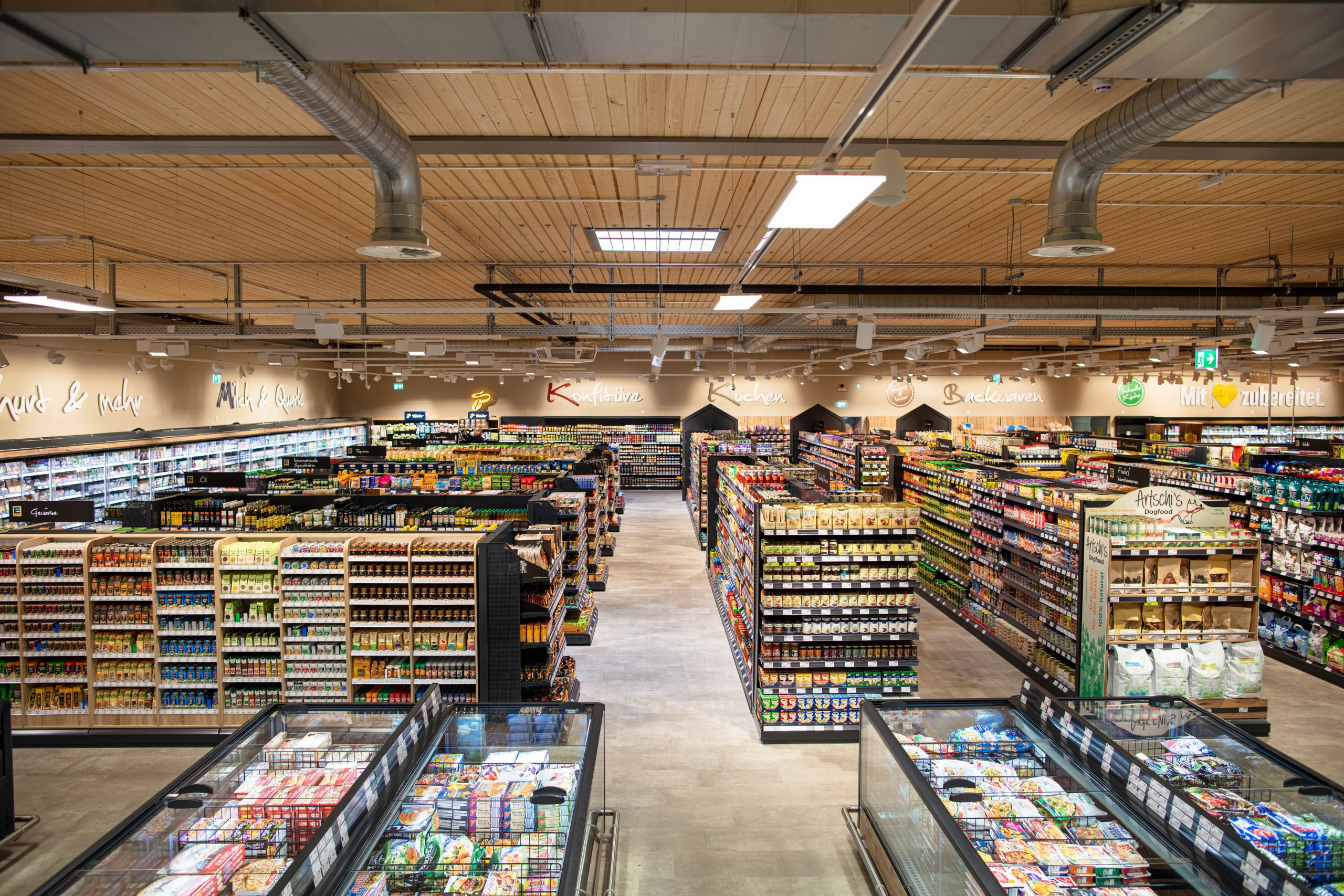 Dank der eingesetzten KIELSTEG Elemente verfügt der Verkaufsraum des Marktes über eine sehr große stützenfreie Fläche, die flexibel eingerichtet werden kann.