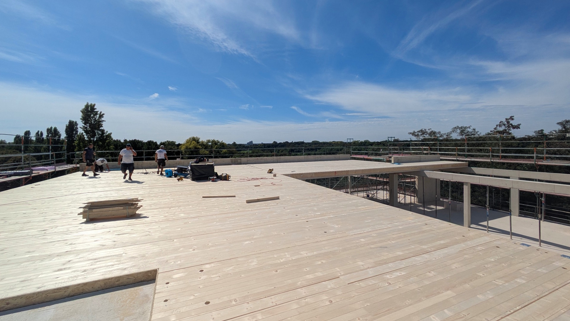 Der Neubau mit Tiefgarage, ebenerdigen Lagerflächen und darüber liegenden Büroräumen zeichnet sich durch seine maximale Nutzungsflexibilität auf minimaler Fläche aus. Einen wertvollen Beitrag zur Flächeneffizienz leisten dabei auch die KIELSTEG Dachbauelemente aus Holz. Die leichten und hochtragfähigen Elemente sind prädestiniert für große Spannweiten und erlauben so ein freies Bespielen der darunter liegenden Räume.