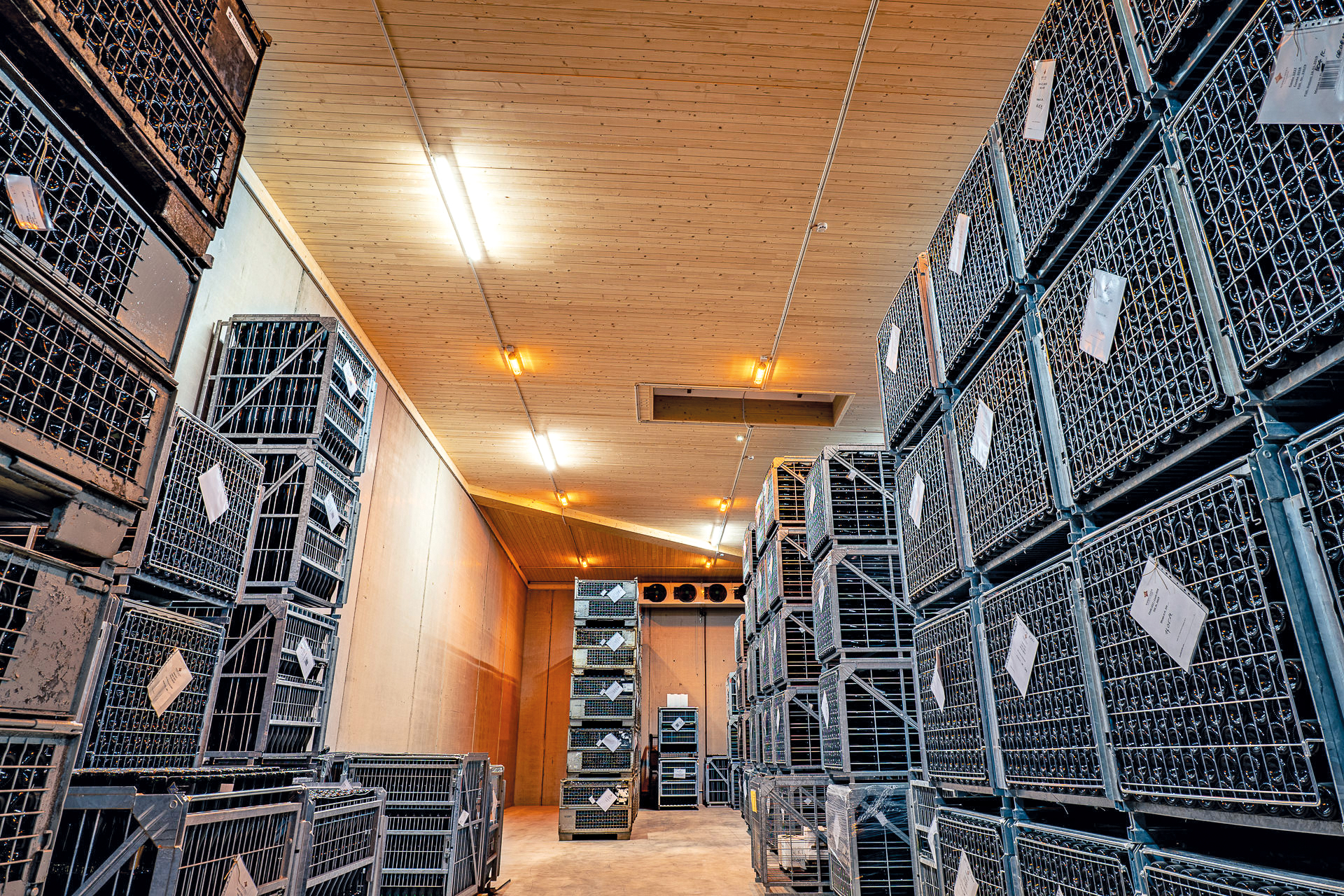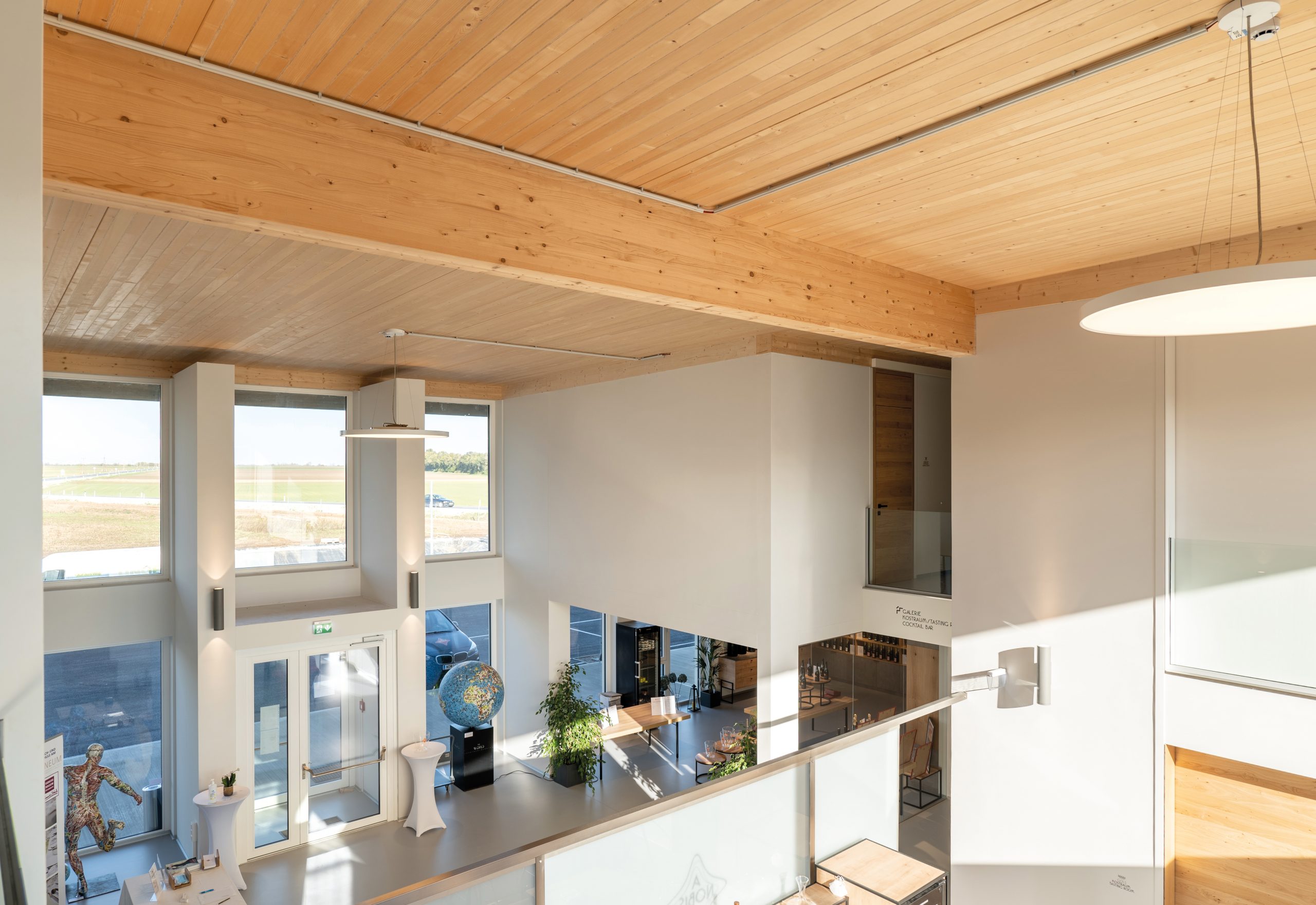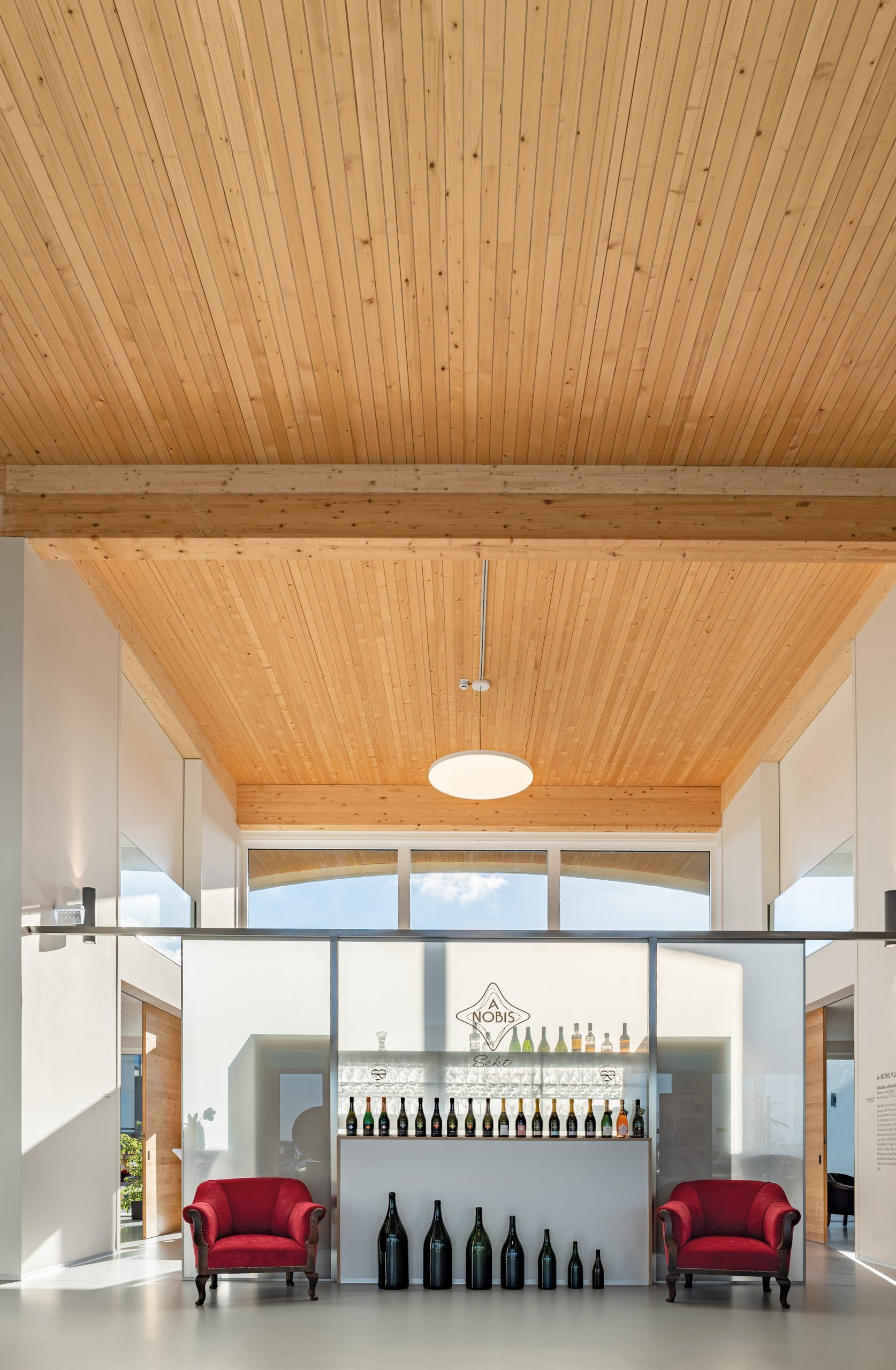 A-NOBIS steht für herausragenden Schaumweingenuss und bringt dies mit der Realisierung der neuen Sektkellerei deutlich zum Ausdruck. Das Gebäude bildet ein rechteckiges Atrium über dem sich das Dach in Form eines Okulus den Elementen öffnet. Ein Wald mit 3.000 Bäumen wurde um die Kellerei gepflanzt. Das Gebäude ist zur Gänze aus heimischen Holz gebaut. Das 2.634 m² große KIELSTEG Dachtragwerk besteht aus 33 cm hohen Elementen, es überspannt die gesamte Gebäudetiefe und bildet zugleich die auskragenden Vordächer. Das begrünte Dach trägt eine PV- Anlage die 100% Ökostrom bereitstellt.